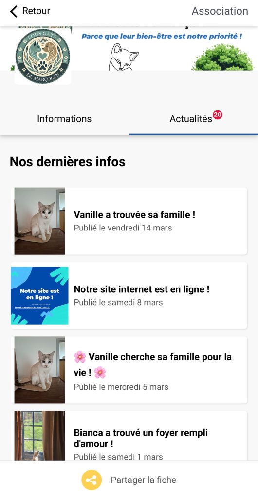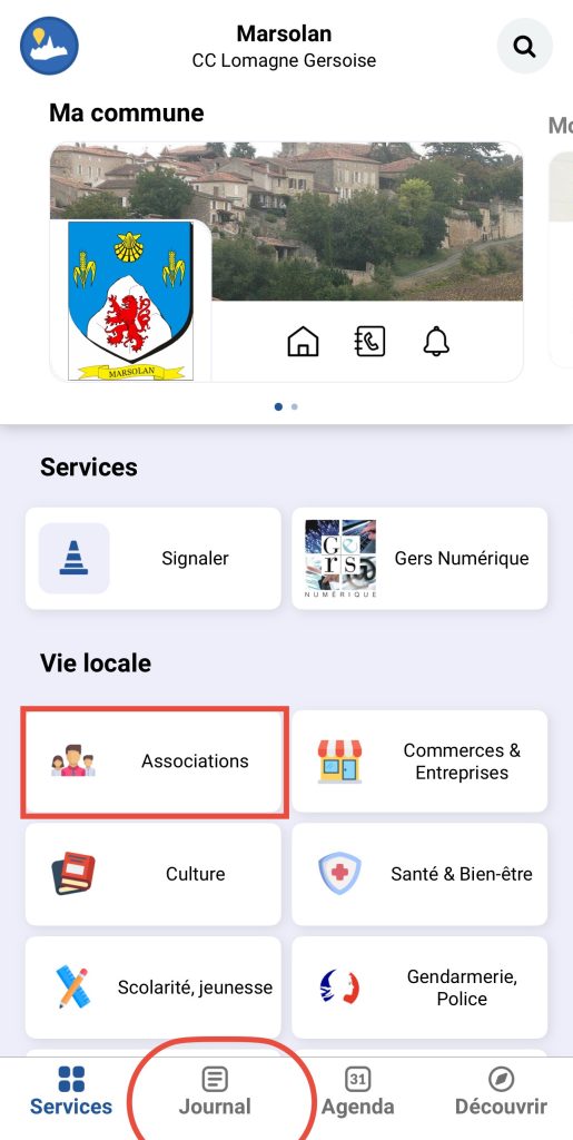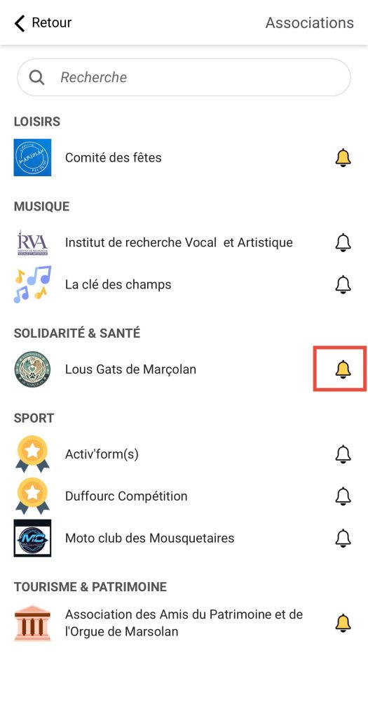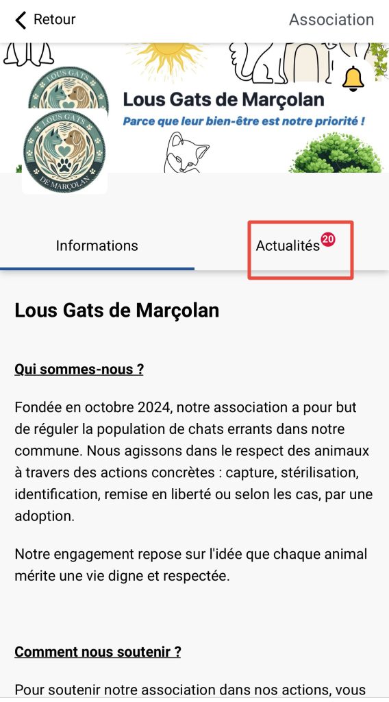 Lorsque vous êtes sur la page « Associations » rendez-vous sur Lous Gats de Marçolan. Pour être tenu au courant de nos actualités, cliquer sur la cloche pour qu’elle devienne jaune. Cela vous permettra de recevoir des notifications de l’application lorsque nous publions sur l’application !