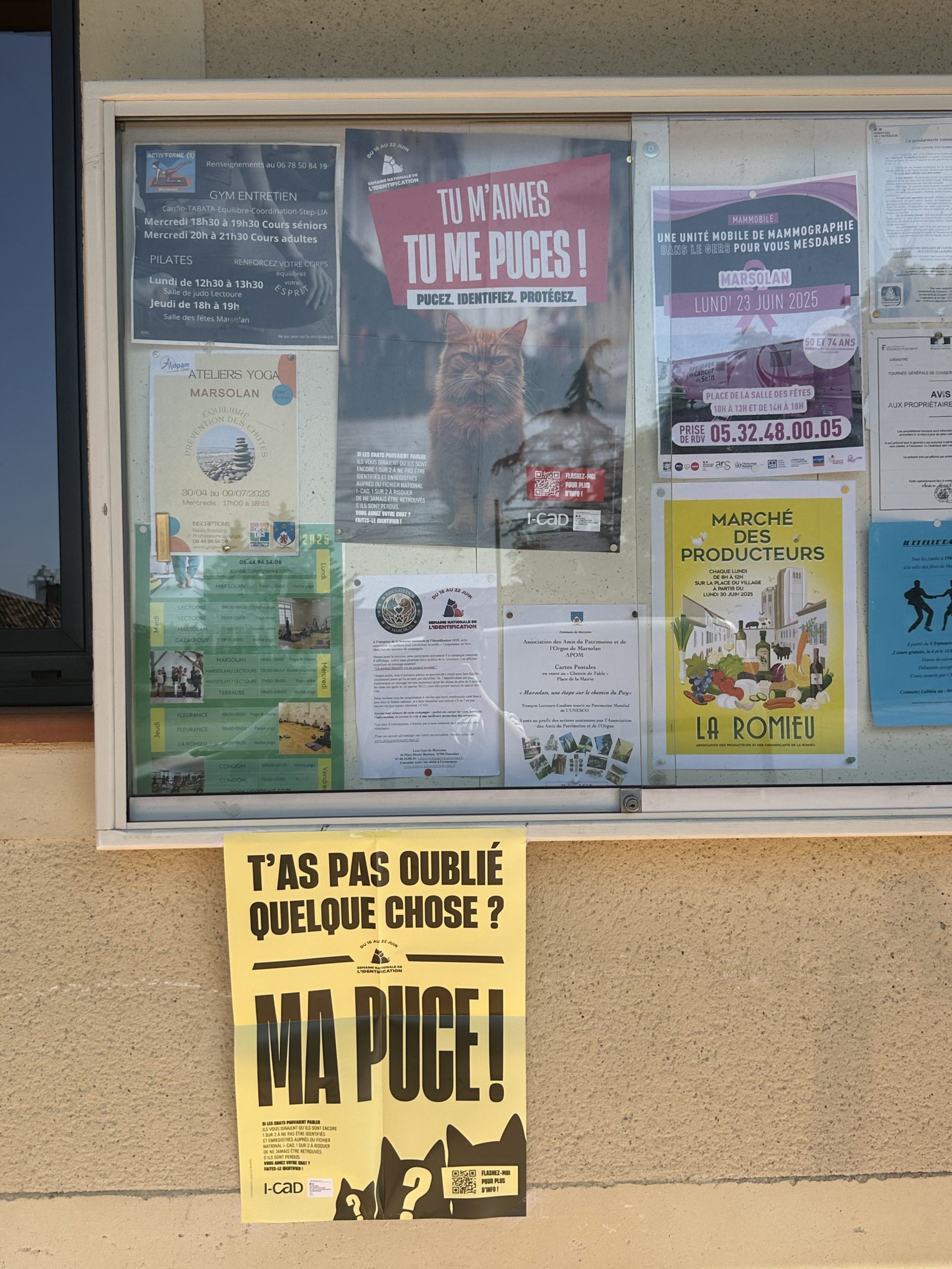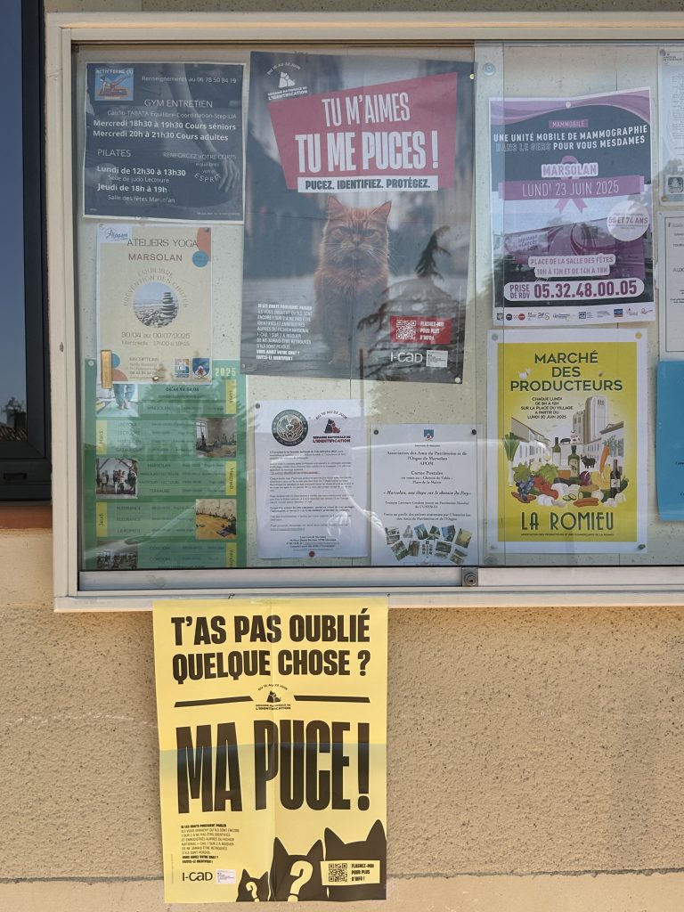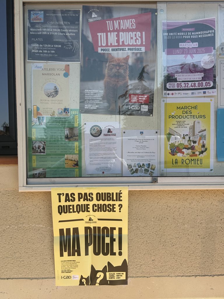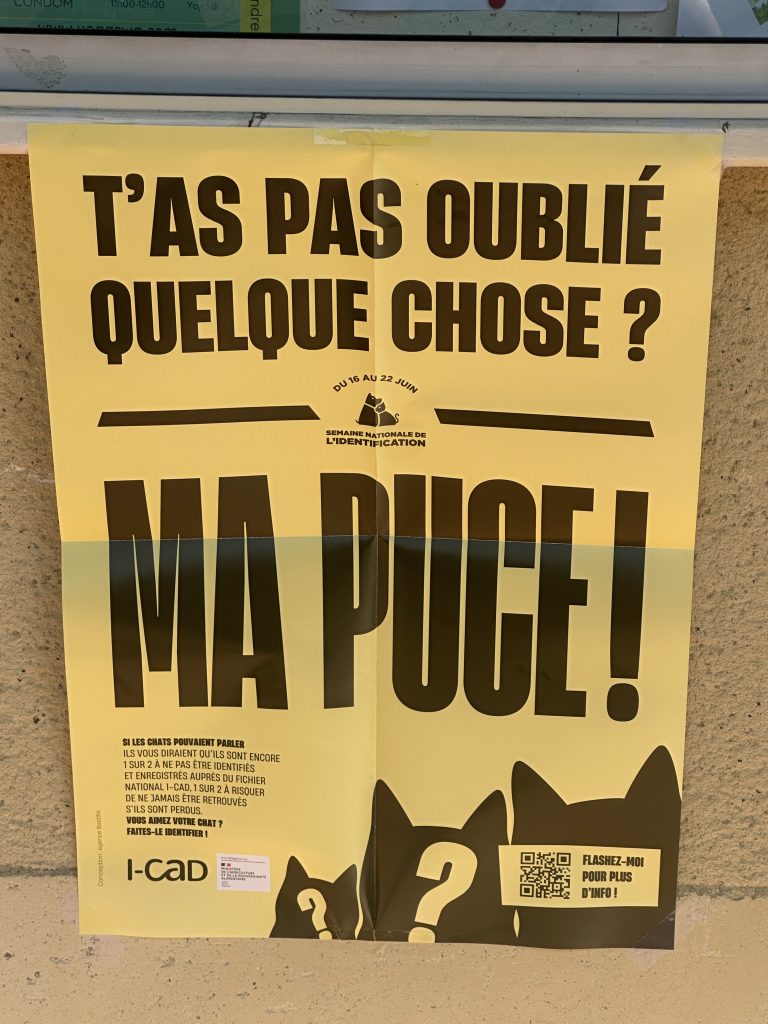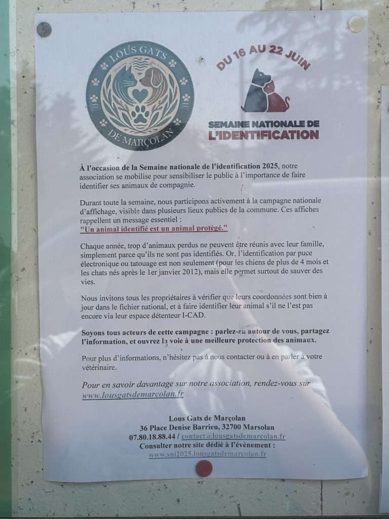 En accord avec la municipalité, dans le cadre de la Semaine Nationale de l’Identification, nous avons déposé des affiches sur la commune. Elles ont un objectif commun : sensibiliser le public aux questions d’identification et de stérilisation.